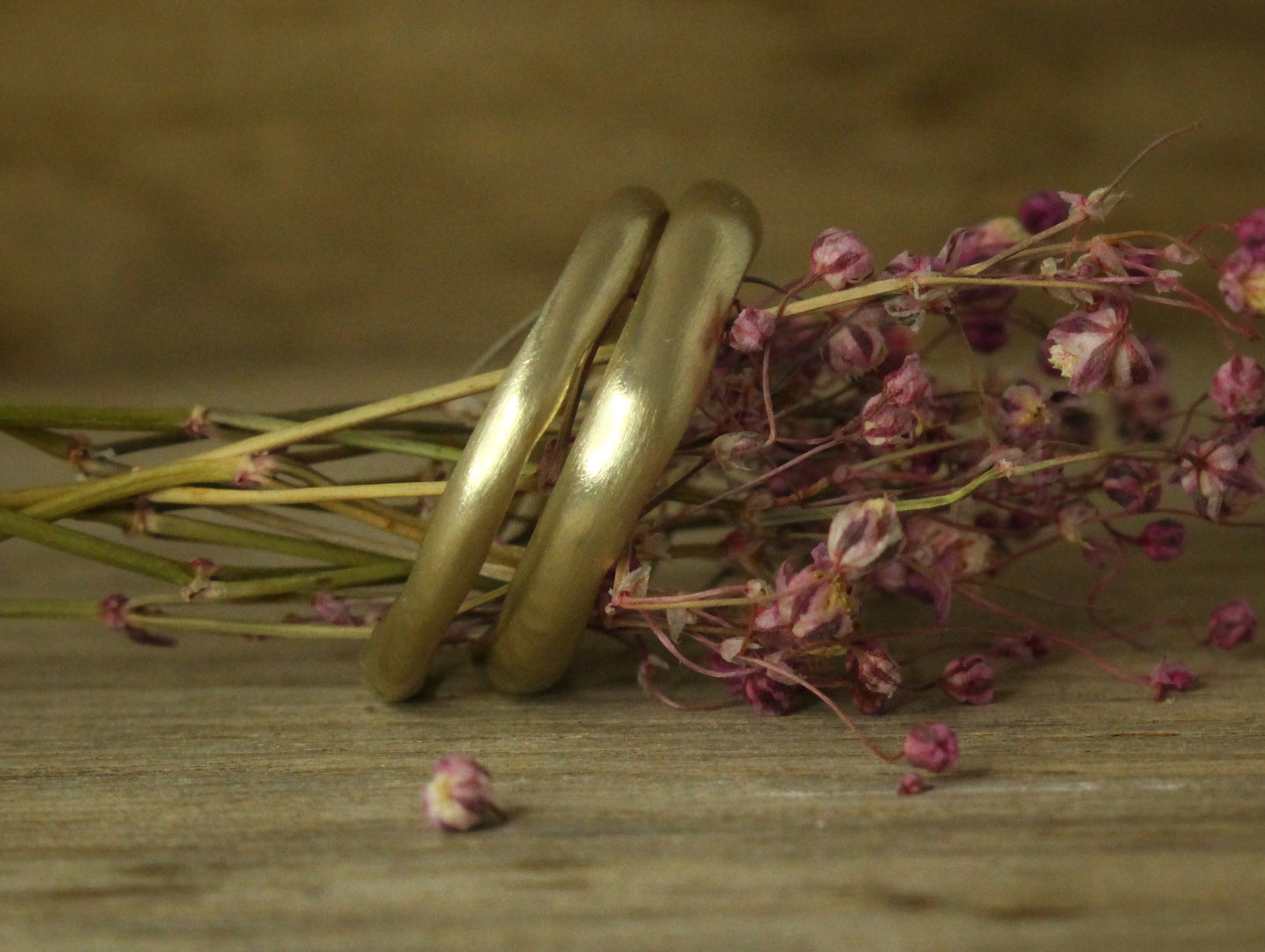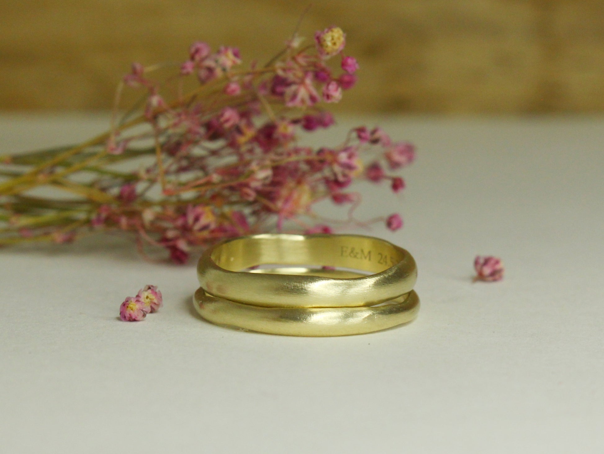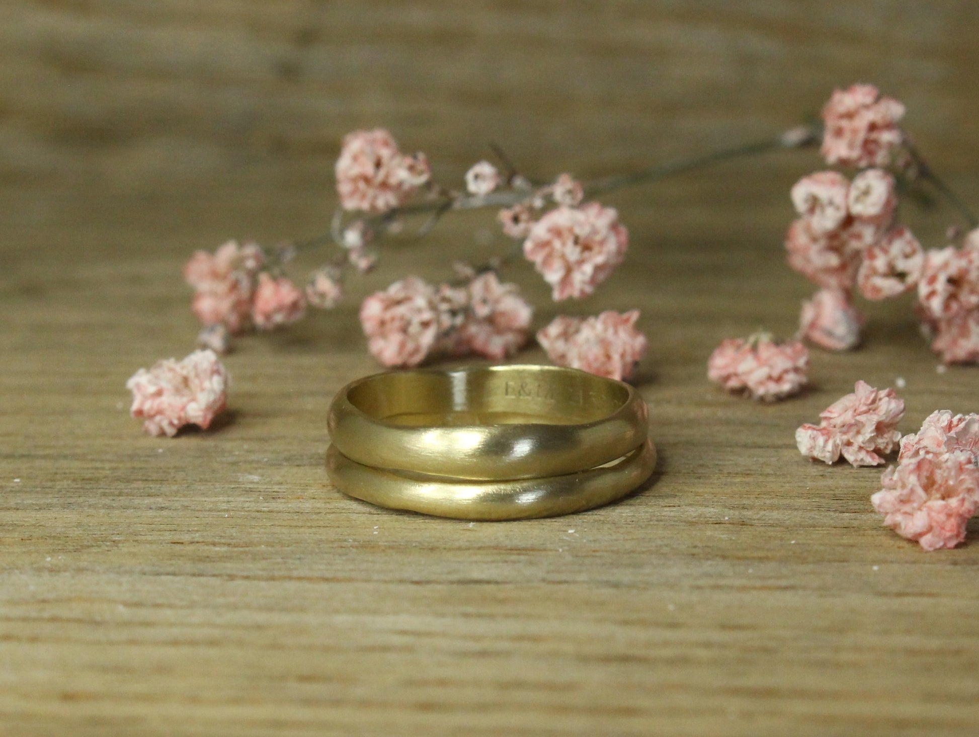 A set of two Artefact bands, substantial, rustic, and organic, for those of us who prefer a more organic and slightly irregular shape, a treasure that looks as if it was around a thousand years ago. I make these rings with a brushed matte finish, in 8ct or 14ct or 18ct Recycled Yellow Gold. The narrower ring has an approximate width of 2.50mm, and the wider ring has an approximate width of 3.50mm. The thickness is 1.20mm. Any other widths/thicknesses can be made on request.