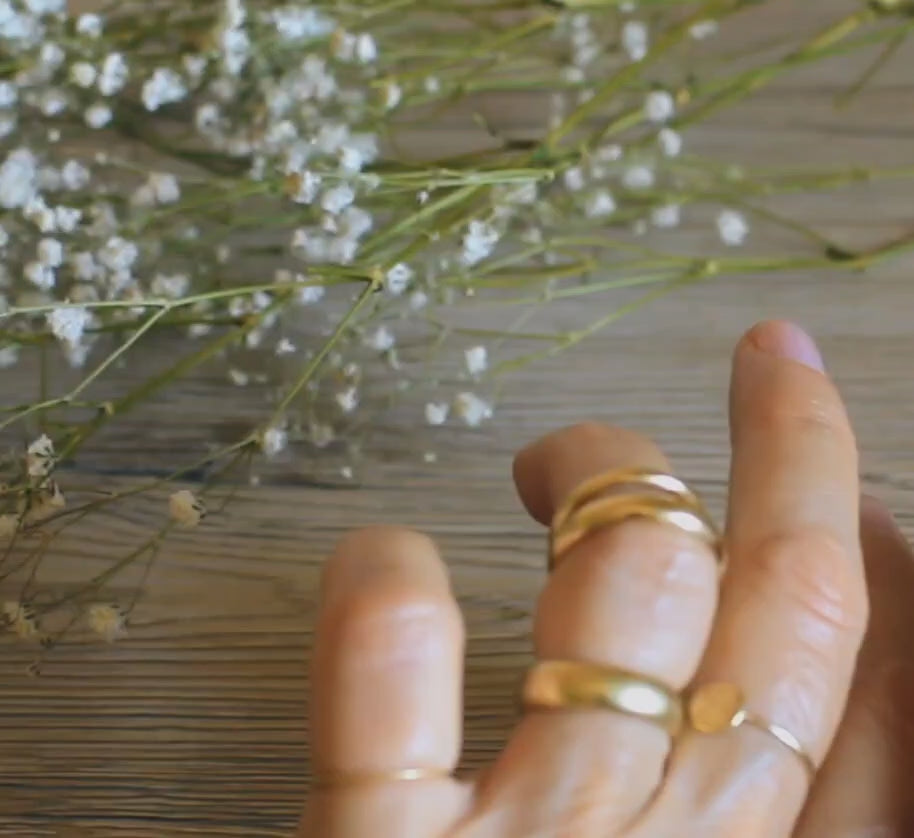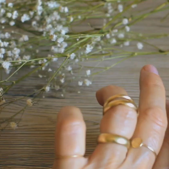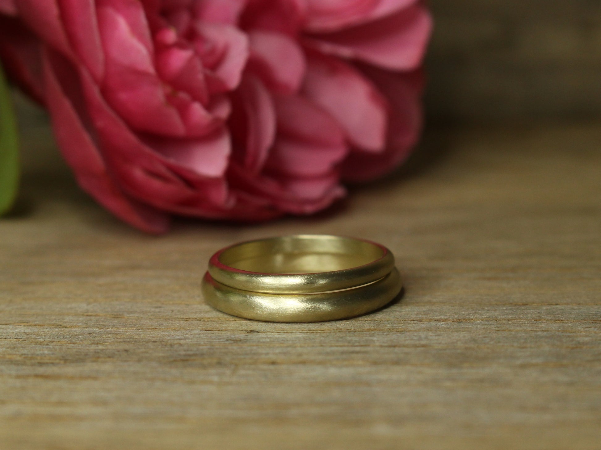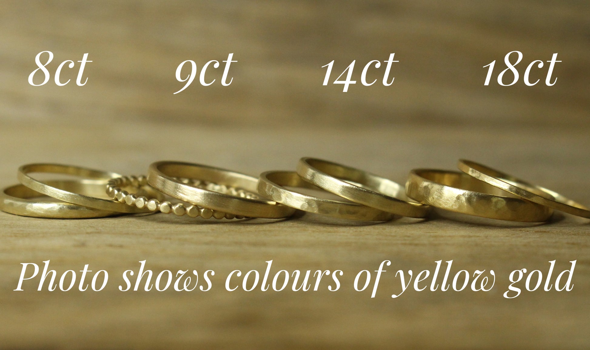 Finished in a satin brushed finish which brings out the beauty in gold. I can also do a frosted finish, which you can see on the wider 3mm band in some of the photos, or a polished finish. If you prefer I can also give the rings a light hammered texture. Unless you request a different finish, the rings will be made in the brushed satiny finish.