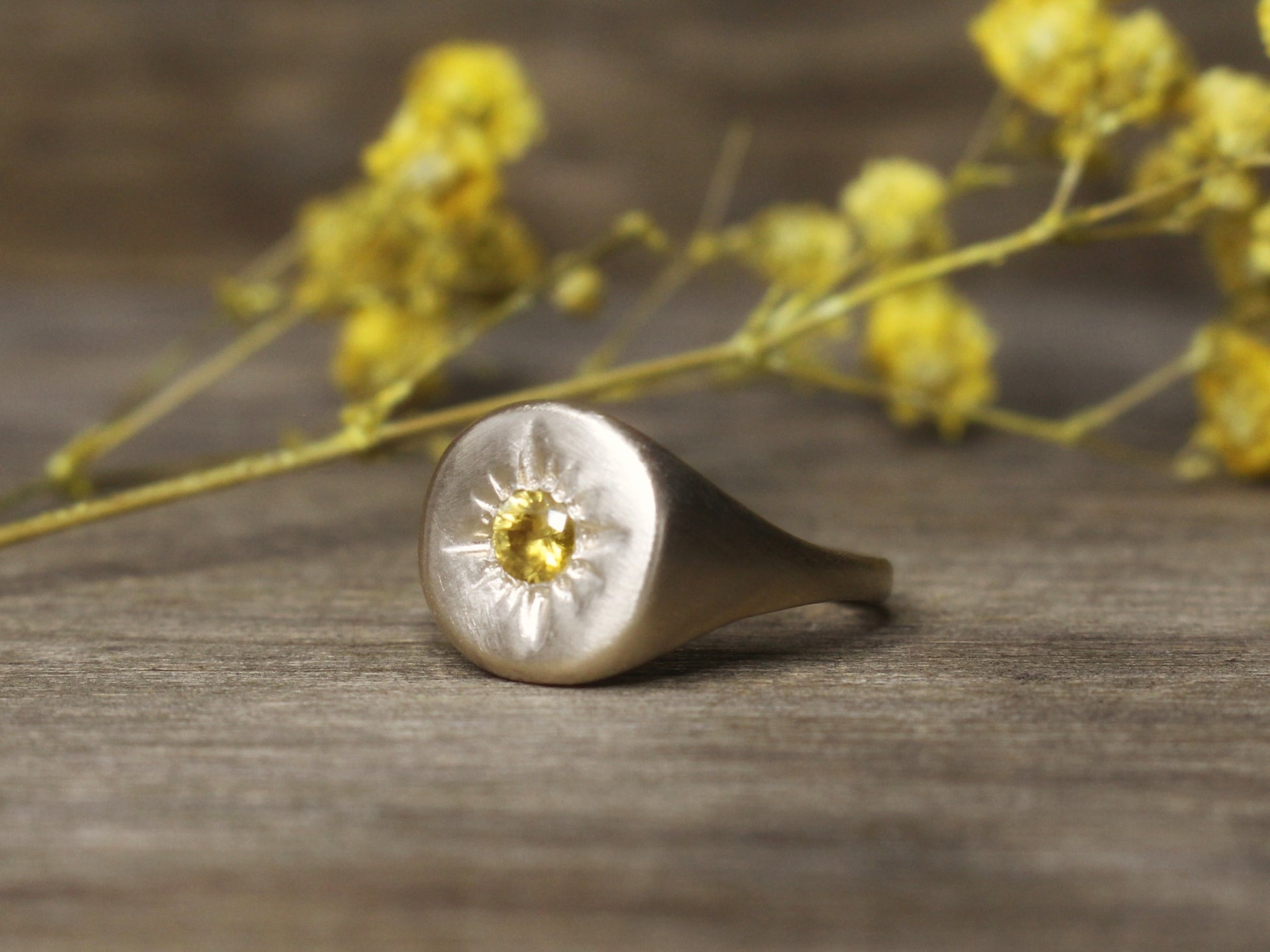 This particular ring is a size 50 in 9ct Recycled yellow gold, the gemstone is a 3.5mm Fair Trade yellow sapphire. The top part is approx. 10mm in diameter, and the band at the thinnest point is approx. 1.6mm. This is a one-of-a-kind valuable ring holding a lot of solid gold, and it weighs approx. 5 grams.